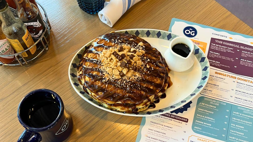 Stack of 3 Buttermilk Pancakes, Chocolate Sauce, Caramel, Shortbread Crumble, Toasted Coconut