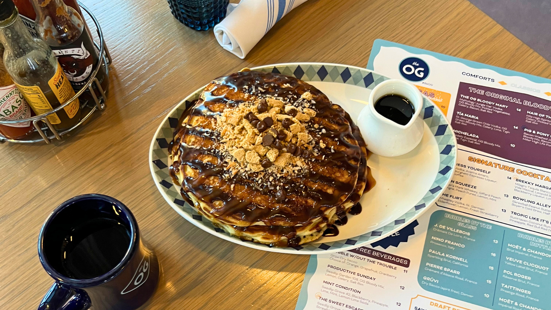 Stack of 3 Buttermilk Pancakes, Chocolate Sauce, Caramel, Shortbread Crumble, Toasted Coconut